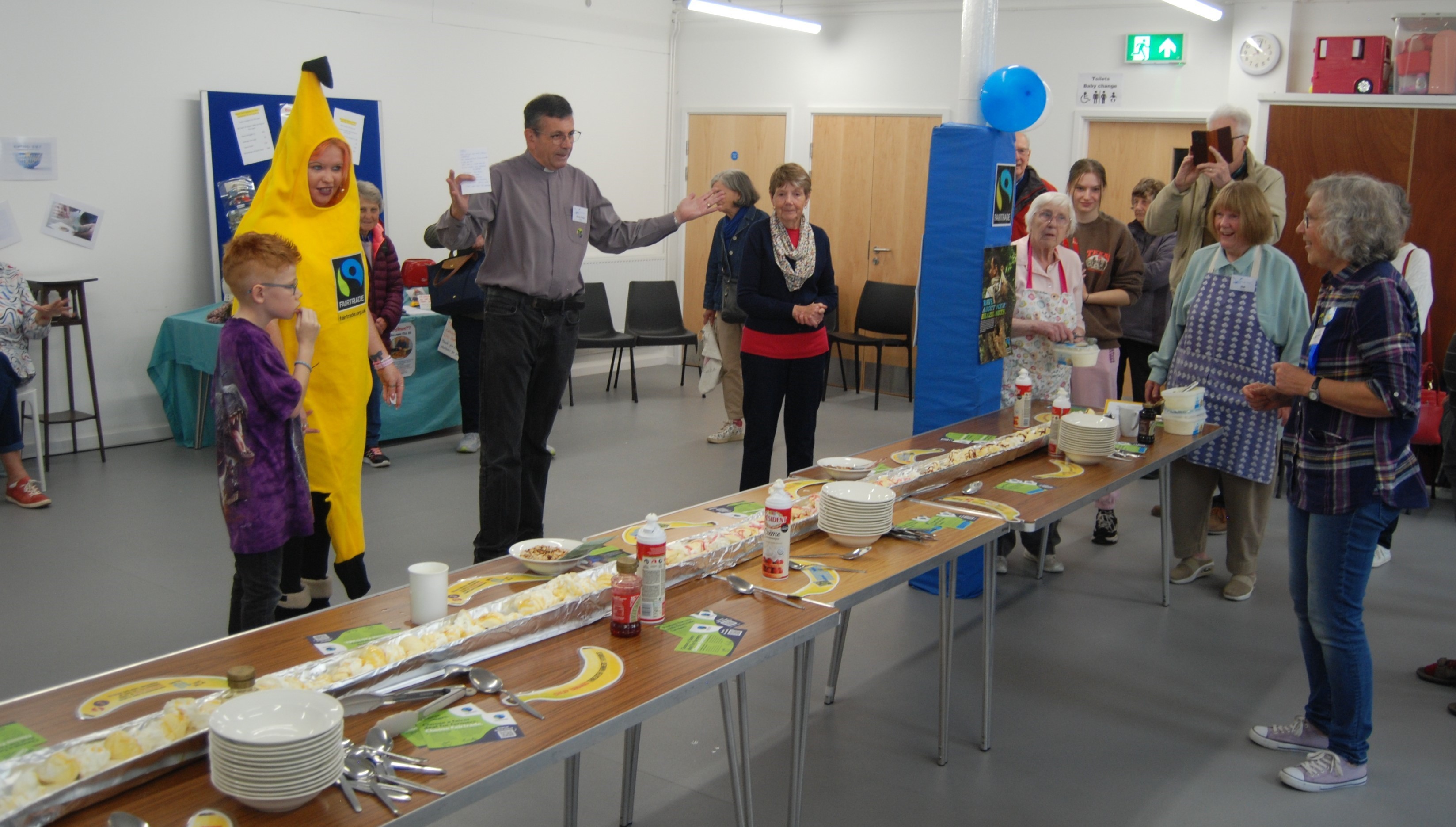 The occasion was the 10th anniversary celebration of the merging of the Methodist and Baptist churches in Wirksworth to form a new church, Wellspring. The birthday fell within Fairtrade Fortnight and the aim of the banana split was to point out that that despite the success of Fairtrade over the last thirty years, only one in three bananas consumed in the UK is a Fairtrade banana.